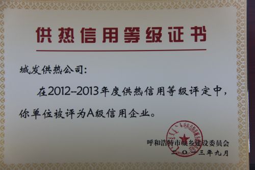 呼市城發(fā)供熱被評(píng)為A級(jí)信用企業(yè)