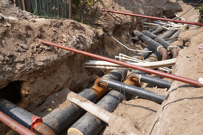 在開天花園小區(qū)熱力站供熱管線出口區(qū)域,兩名工人師傅正在清理現(xiàn)場的供熱管線。現(xiàn)場看到管溝內(nèi)鋪設(shè)的主管線、與樓宇的抽頭安裝已全部完工,溝內(nèi)自來水管線、污水管線、弱電管線、強(qiáng)電管線縱橫交錯(cuò)。