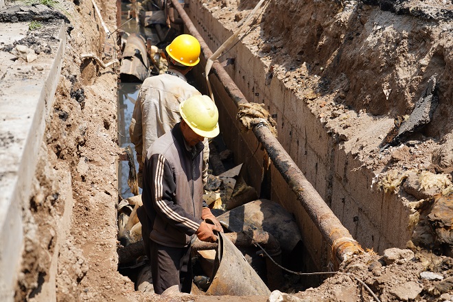 據(jù)施工方介紹,"該小區(qū)供熱管線總長約7000米,供熱管道因長期浸泡在污水中,腐蝕嚴(yán)重。如意小區(qū)分A、B、C三個(gè)區(qū),還有東西商網(wǎng),目前僅僅B區(qū)的供熱管溝內(nèi)污水較少,A、C兩個(gè)區(qū)、東西商網(wǎng)的地溝內(nèi)幾乎全部是污水,最深的管溝內(nèi)深度達(dá)到了近1.2米,給施工增加了難度。每天早上開始用三臺(tái)泵抽排污水,中午休息1個(gè)半小時(shí)后,開始施工時(shí),溝內(nèi)又有了污水。尤其是經(jīng)過一晚上的停工,第二天溝內(nèi)污水深度又達(dá)到了1米多。為確保工期,不影響按期供暖,目前采取分段式施工方案,先抽干地溝中的污水,再進(jìn)行管道更換。三伏天,工人師傅們穿著連體防水服,忍受著刺鼻的氣味,在污水深達(dá)一米多的地溝內(nèi),一泡就是一天。施工至今已近二個(gè)月,每一天他們都是這樣重復(fù)著工作,清理不斷涌出的污水,拆除舊管,鋪設(shè)新管,一天的工作后,打濕衣服的不只是污水還有汗水。"
