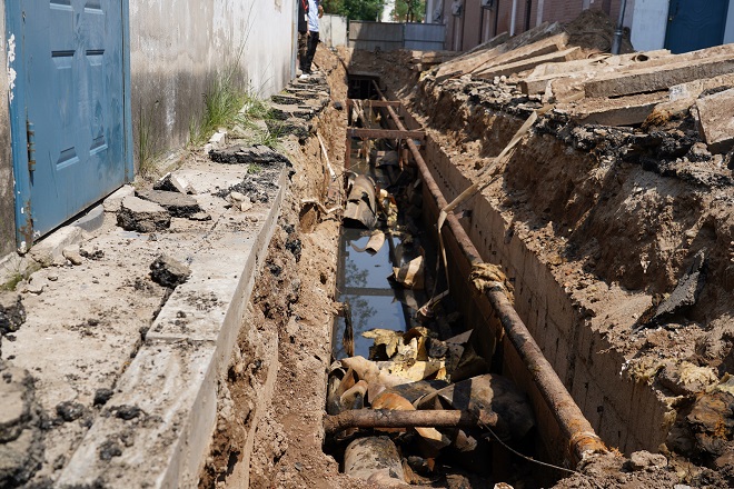 開天花園小區(qū)施工直播結(jié)束后,我們直播組直奔如意小區(qū)供熱二次管網(wǎng)改造的施工現(xiàn)場。循著一陣陣的臭味,我們來到了如意小區(qū)的A區(qū)一幼兒園后面,映入眼簾的是正在抽排污水的地溝,地溝中的供熱管線距污水水面非常近,污水在炎熱天氣的發(fā)酵下,臭氣熏天。工人們正在深溝里進(jìn)行排污及淤泥清理工作,每一個(gè)動(dòng)作都顯得格外艱難,衣服幾乎和污水一個(gè)顏色。